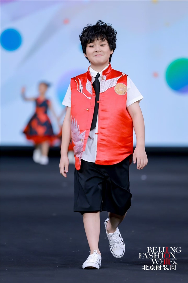 设计师林兰女士为其特别定制,核心视觉锚点正是小鹤鹤品牌极具辨识度的红底白鹤织锦面料。设计上巧妙融合传统美学与现代剪裁:正红底色延续了中国传统文化中“朱红为贵”的基因,既显热情活力,亦传递出积极向上的能量;让经典纹样焕发出属于当下的时尚活力。在T台的聚光灯下,传统织锦工艺与现代剪裁的融合,象征着文化血脉在新时代的赓续。小鹤鹤通过这样的设计,旨在告诉每一位像龚喜一样的少年:你们的潮流,根植于东方美学的沃土;你们的自信,来源于对自身文化的深刻理解与自豪。