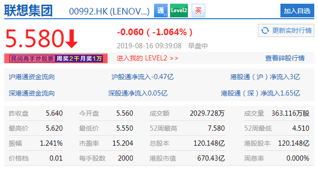 8月16日上午消息,截至9:39,联想集团(00992.HK)下跌1.06%,报5.58港元。