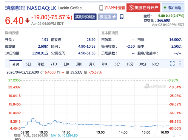 北京时间4月3日凌晨消息,瑞幸咖啡周四发布公告,承认在2019年第二季度到第四季度期间存在伪造交易行为,涉及销售额大约22亿元人民币之后,瑞幸咖啡触发多次熔断,股价一度暴跌逾80%。截止收盘,瑞幸咖啡下跌75.57%报6.40美元,市值为16亿美元。