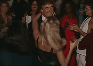 在一个场景中,特朗普与四名女子并排站立,拍照。期间,他还搂着一名穿绿色短裤女子的腰,而在结束拍照以后,他还拍了拍了这名女子的臀部。