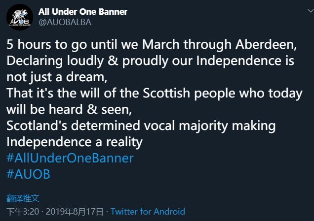 AUOB说:“在阿伯丁5个小时的游行中,我们大声并且骄傲地宣布独立不仅是一个梦想。今天,苏格兰民众的意志已经被听到和看到,苏格兰大多数人坚定的声音将会让独立成为现实。”