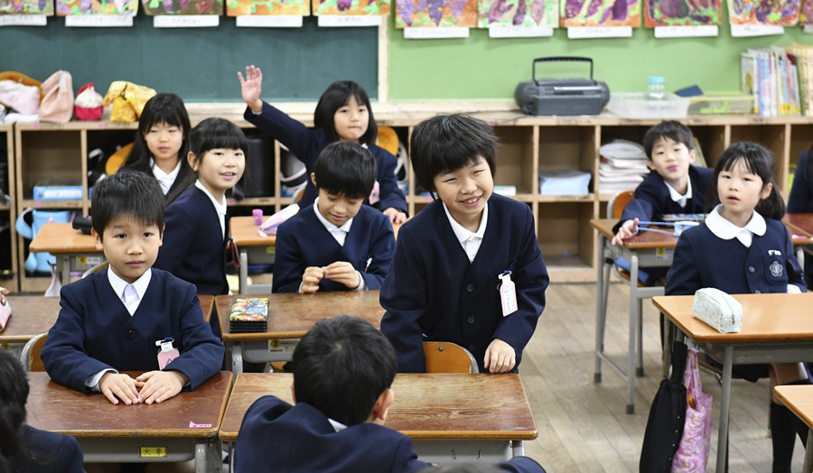 卡米南部小学(Kaminanbu Elementary School)的孩子们向老师展示寒假作业。
