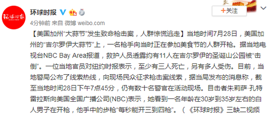 当地时间7月28日,美国加州的“吉尔罗伊大蒜节”上,一名枪手向当时正在参加美食节的人群开枪。据当地电视台NBC Bay Area报道,救护人员透露约有11人在吉尔罗伊的圣诞山公园被“击倒”。一位当地官员对纽约时报表示,至少有三人死亡,另有多人受伤。目前,当地警局公布了线索热线,向现场民众征求枪击案线索,据当局发布的消息称,截至当地时间28日下午7点45分,仍有数十名警官在活动现场。目击者朱莉萨·孔特雷拉斯向美国全国广播公司(NBC)表示,她看到一名年龄在30岁到35岁左右的白人男子在开枪,他手中的步枪“每秒能开三到四枪”。