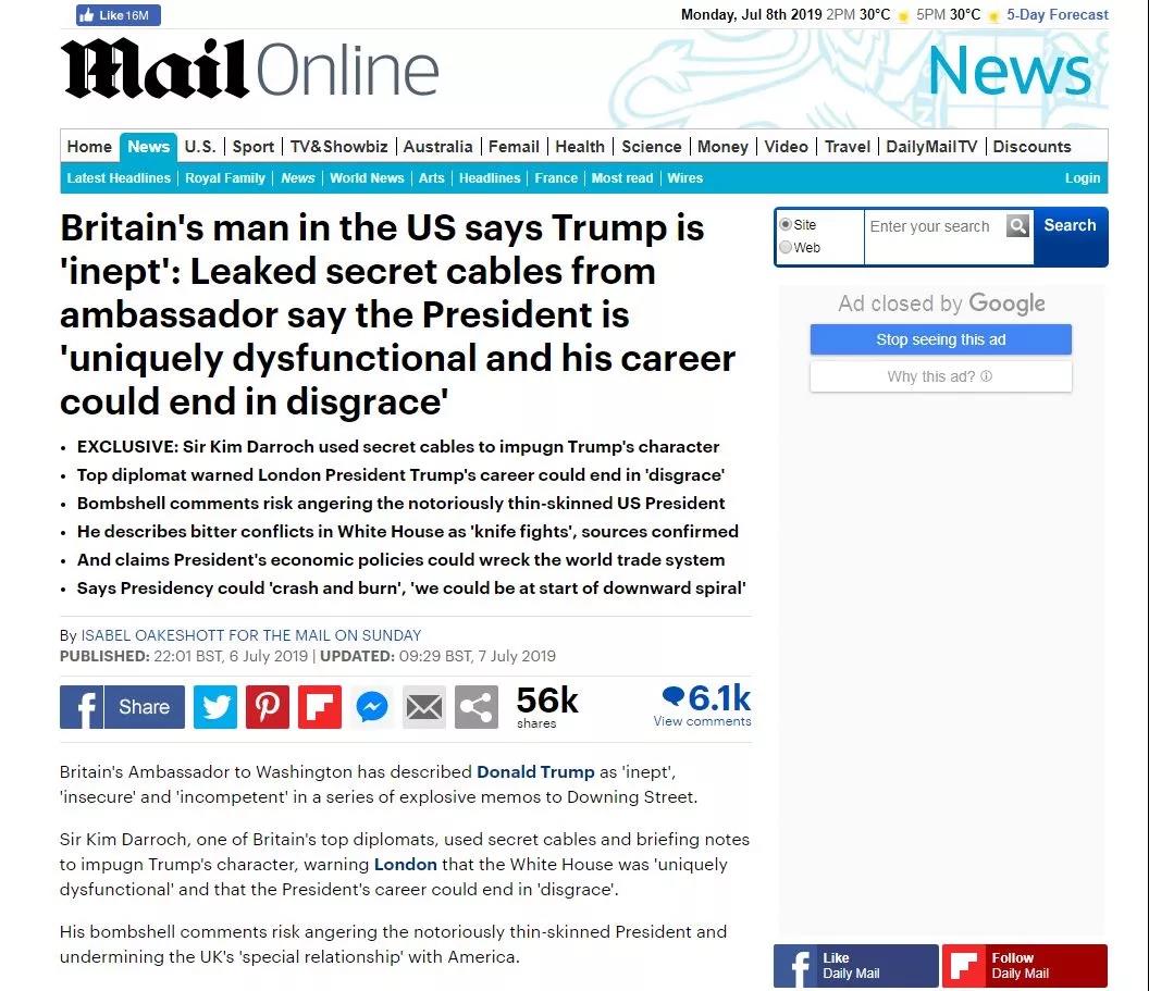 这两天英美两国外交遭遇大风波。英国驻美大使金·达罗克爵士(Sir Kim Darroch)的多封机密外交电报和备忘录被曝光,时间覆盖2017年特朗普就任总统至今。