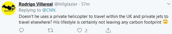 网友“Rodrigo Villareal”说:“他不是开私人直升机在英国国内旅行,还把私人飞机开到其他地方旅行吗?他的生活方式当然不会留下任何碳足迹”