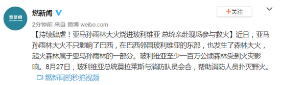 近日,亚马孙雨林大火不只影响了巴西,在巴西邻国玻利维亚的东部,也发生了森林大火,起火森林属于亚马孙雨林的一部分。玻利维亚至少一百万公顷森林受到火灾影响。8月27日,玻利维亚总统莫拉莱斯与消防队员会合,帮助消防人员扑灭野火。