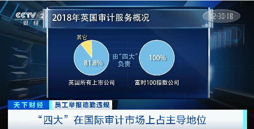 外界对于审计行业也一直有不少担忧,首先,就是“四大”在国际审计市场上的绝对性主导地位。以英国为例,据英国财务报告委员会数据显示,在2018年,英国所有上市公司中有81.8%的审计工作由“四大”负责,同一年,英国富时100指数公司的审计工作则全部由“四大”完成。