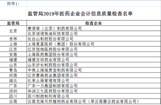北京青年报记者今日从财政部证实,财政部会同国家医保局成立部际协调工作组,将开展医药行业会计信息质量检查工作,77家企业被列入稽查检查名单。财监(2019)第18号加急文件显示,包括赛诺菲、施贵宝等国际知名药企和复星医药、恒瑞医药、步长制药、上海医药等A股多家上市药企都在该份检查名单中。文件要求,重点围绕医药企业的费用、成本和收入的真实性进行检查。其中包括向医疗机构或医务人员销售返点现象。