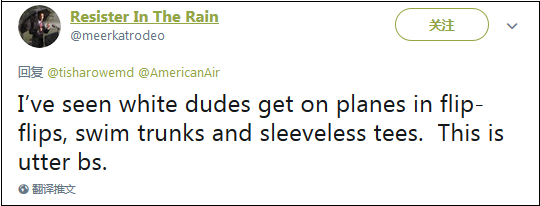 其中一位网友表示:“我见过有白人穿着人字拖、游泳短裤和无袖衫登机,(不让你登机)简直是胡扯。”