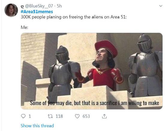 表情包: 当他们问我为什么我冲进51区——我刚在Facebook上看到了宣传觉得看上去还蛮好玩的