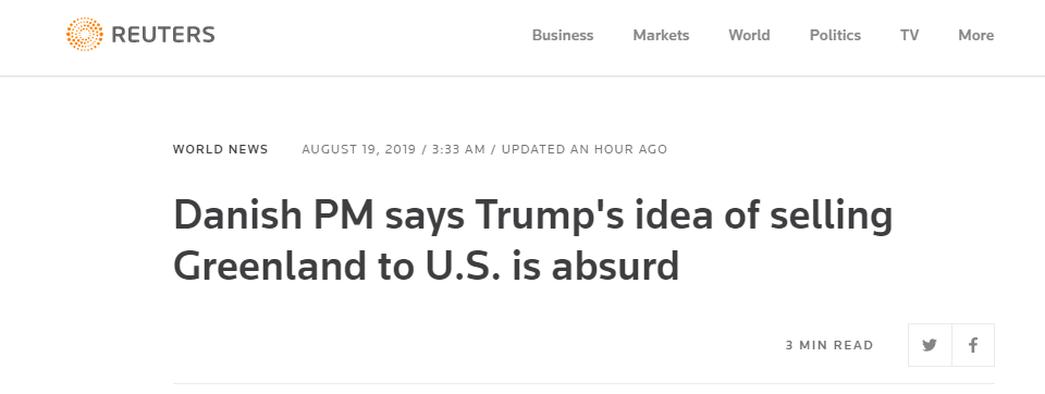 此前,美国《华尔街日报》16日援引知情人士的话报道称,特朗普曾多次询问其顾问,美国能否购买格陵兰岛。该岛为世界第一大岛,位于北冰洋和大西洋之间,是丹麦的自治领土。在其他人讨论格陵兰岛丰富的资源和地缘政治的重要性时,特朗普饶有兴趣地倾听他们的谈话。知情人士表示,特朗普还要求其顾问研究这个想法。 这一消息被曝出后,丹麦多位政界人士站出来表态,美国这一想法实属好笑。丹麦前首相拉尔斯·勒克·拉斯穆森15日也曾表示,“这一定是愚人节的玩笑。完全不合时宜!”除此之外,格陵兰岛自治政府外交部也对此回应称,“我们欢迎生意上的合作,但我们不卖(格陵兰岛)。”