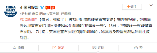 据外媒报道,英国海外领地直布罗陀15日决定释放伊朗油轮“格蕾丝一号”。18日,“格蕾丝一号“驶离直布罗陀。 7月初,英国在直布罗陀扣押伊朗油轮,称其违反欧盟制裁运油前往叙利亚。