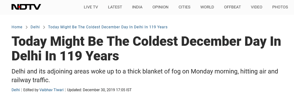 IMD称, 12月30日的最高气温只有9.4摄氏度。该地区天气预报中心主任库尔迪普•斯里瓦斯塔瓦(Kuldeep Srivastava)表示,当天的气温几乎只有正常水平的一半。