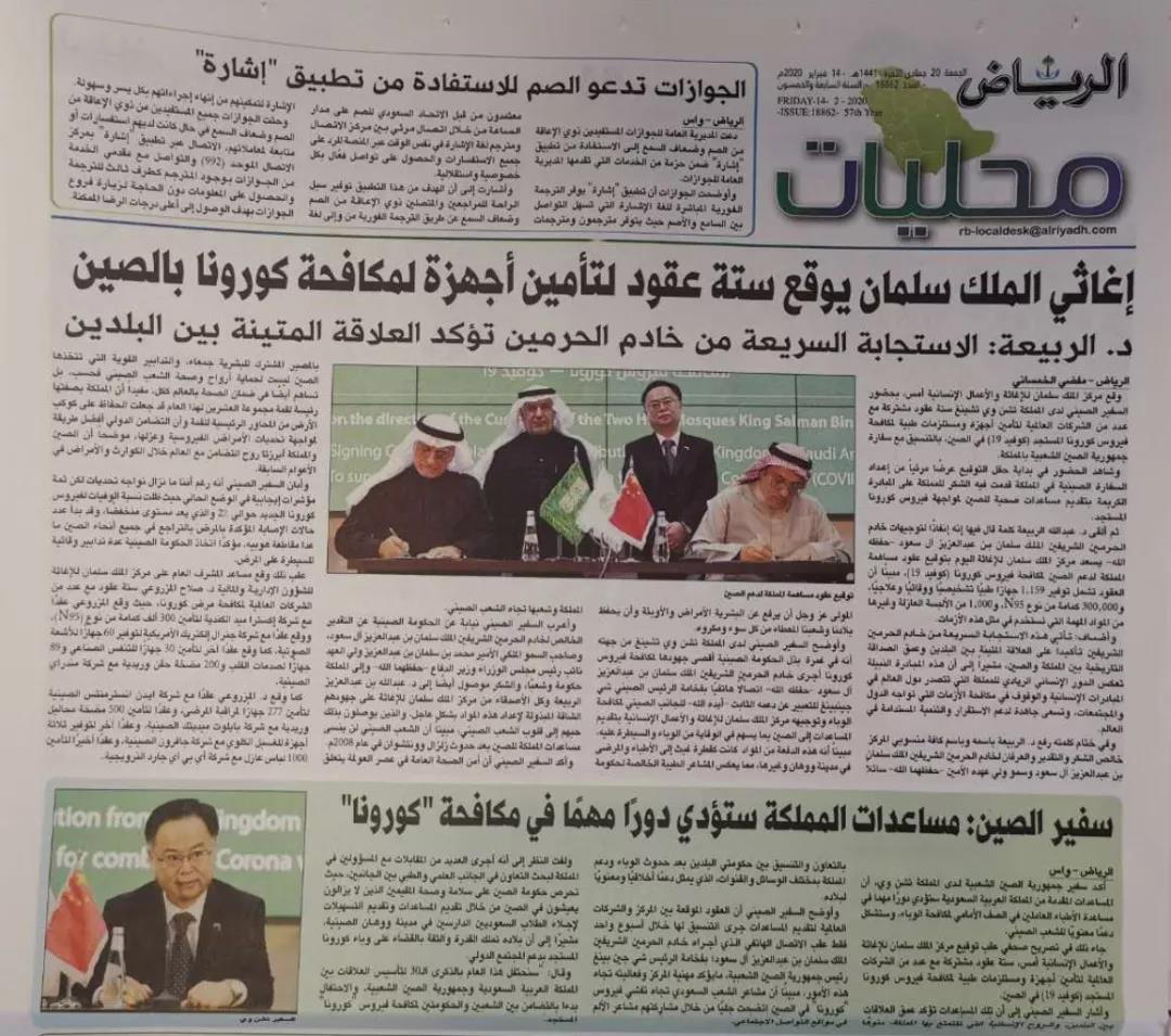 沙特媒体高度关注此事。沙特电视台、沙特新闻电视台、阿拉比亚电视台对防护物资签字仪式进行直播报道,并在整点新闻节目中持续滚动跟踪。《利雅得报》《中东报》《经济报》《赛百格电子报》等媒体均在主要版面报道有关消息。