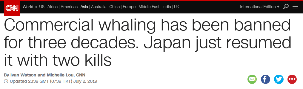 CNN说,国际捕鲸委员会(IWC)1986年的一项暂停令已将商业捕鲸列为禁止。然而,日本已经退出国际捕鲸委员会,并不顾国际社会的强烈抗议,恢复在其领海和经济区进行商业捕鲸活动。