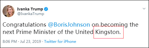 伊万卡也很快在推特上发布了祝贺消息。可眼尖的网友却发现,她在文中却将“联合王国”(United Kindom)错误地拼成了“联合金士顿”(United Kingston)。