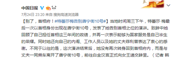 [别了,首相府!#特蕾莎梅告别唐宁街10号#]当地时间周三下午,特蕾莎·梅最后一次以首相身份出现在唐宁街10号,发表了她告别首相之位的演讲。致辞中她回顾了自己担任首相这三年间的政绩,并再一次表示能够为国家服务是自己毕生的荣耀。同时她还向自己的内阁、工作人员以及她的丈夫菲利普表达了衷心的感谢。不同于以往的是,这次演讲结束后,她没有再次转身回到首相府内,而是与丈夫一同乘车离开了唐宁街10号,前往白金汉宫正式向女王递交辞呈。(记者 韩宝仪 视频 欧阳雪妍)