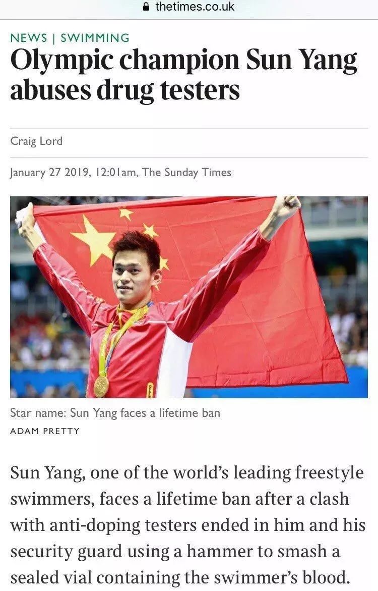 今年1月,英国权威媒体《星期日泰晤士报》发布报道,称去年年底孙杨与反兴奋剂检测员发生冲突,孙杨方利用锤子砸碎装有已经密封的血液样本瓶,此举或将导致孙杨面临终身禁赛。