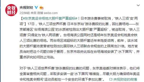 [东京奥运会场地大肠杆菌严重超标!日本游泳赛事被取消,“铁人三项”变“两项”]17日,“铁人三项世界杯赛·日本东京站”游泳赛段的比赛,因比赛场地——东京都港区“台场海滨公园”的水质被检测出大肠杆菌“严重超标”,被迫取消,“铁人三项赛”只得变为“铁人两项赛”。台场海滨公园同时还是明年东京奥运会和残奥会铁人三项比赛的场地。而台场区域超标的大肠杆菌近年来饱受诟病,前年,该水域的大肠杆菌浓度曾被检测出比国际铁人三项联合会规定的上限高出21倍。地方官员当时把这个问题归咎于暴雨,东京市政府此后在台场海域安装了“水下屏风”,并重点研究如何防止污染。