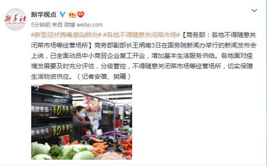 商务部副部长王炳南3日在国务院新闻办举行的新闻发布会上说,已全面动员中小商贸企业复工开业,增加基本生活服务供给。各地面对疫情发展要及时充分评估,分级管控,不得随意关闭菜市场等经营场所,切实保障生活物资供应。(记者安蓓、樊曦)